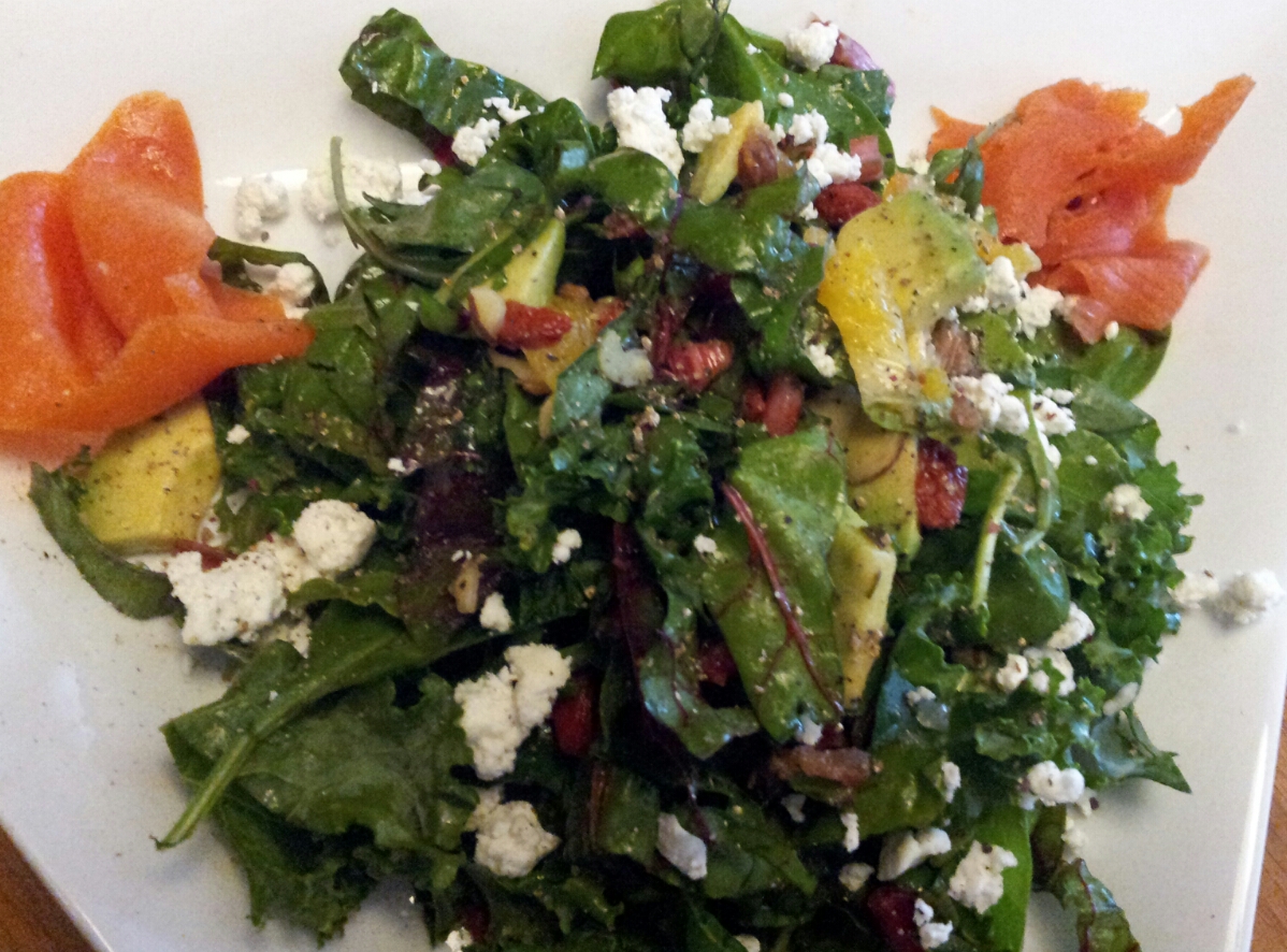 Garden Kale, Rainbow Chard, Spinach w/ Avocado, Orange, Almonds,