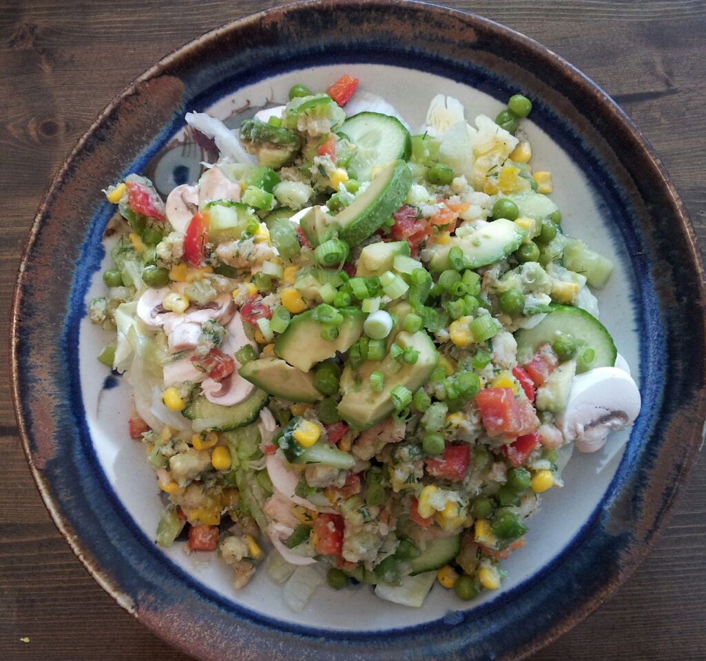 Another “leftover” or “remixed” salad, atop a bed of iceberg (I know!  but it’s so good sometimes!  I don’t hate on any lettuce 🙂  even the nutritionally-void ones :), chopped avocado, tomatoes, cucumbers, mushrooms and green onion….and then instead of a dressing, I used the leftover salad from last night, the shrimp, crab, corn, peas, peppers & dill salad.  Very fresh and crunchy and light, really nice after this hot summery day.