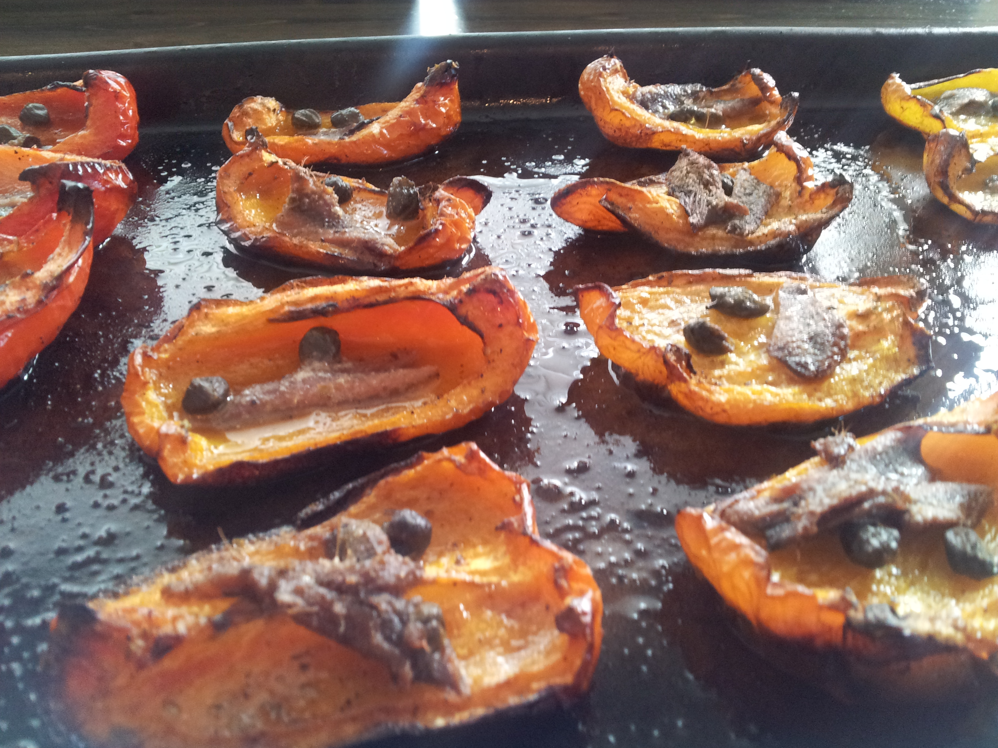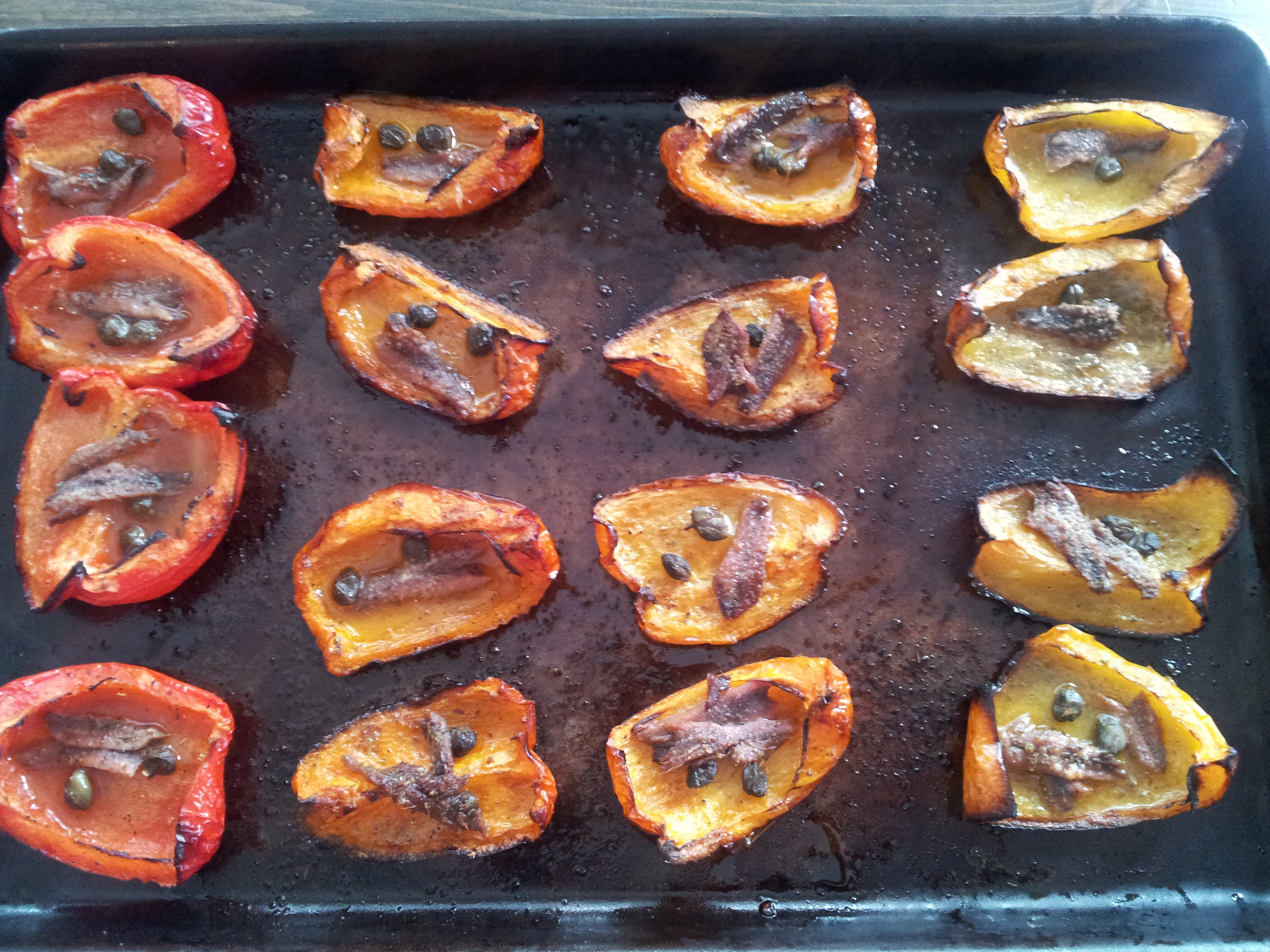 Even though you can find every recipe you could ever dream of or wish for online, I still love cookbooks.  Real, paper, food stained, dog-eared cook books that you can sit and flip through and be inspired by. I love to pull our a big stack and leaf through, planning out my week of cooking or just reading and learning or dreaming up things to make one day…Richard bought me this particular book for Christmas a few years ago, Easy Mediterranean, Simple Recipes from Sunny Shores, by Ryland, Peters & Small….this book has so many wonderful recipes, and I find myself reaching for this cookbook a lot.  Delicious, simple, rustic….and this particular recipe that I’m sharing today is one of my favorites…it’s flavours are really bold, the contrast between the salty anchovies and capers and sweet roasted peppers is absolutely delicious….this is a perfect dish to serve at a party because it’s best at room temperature.