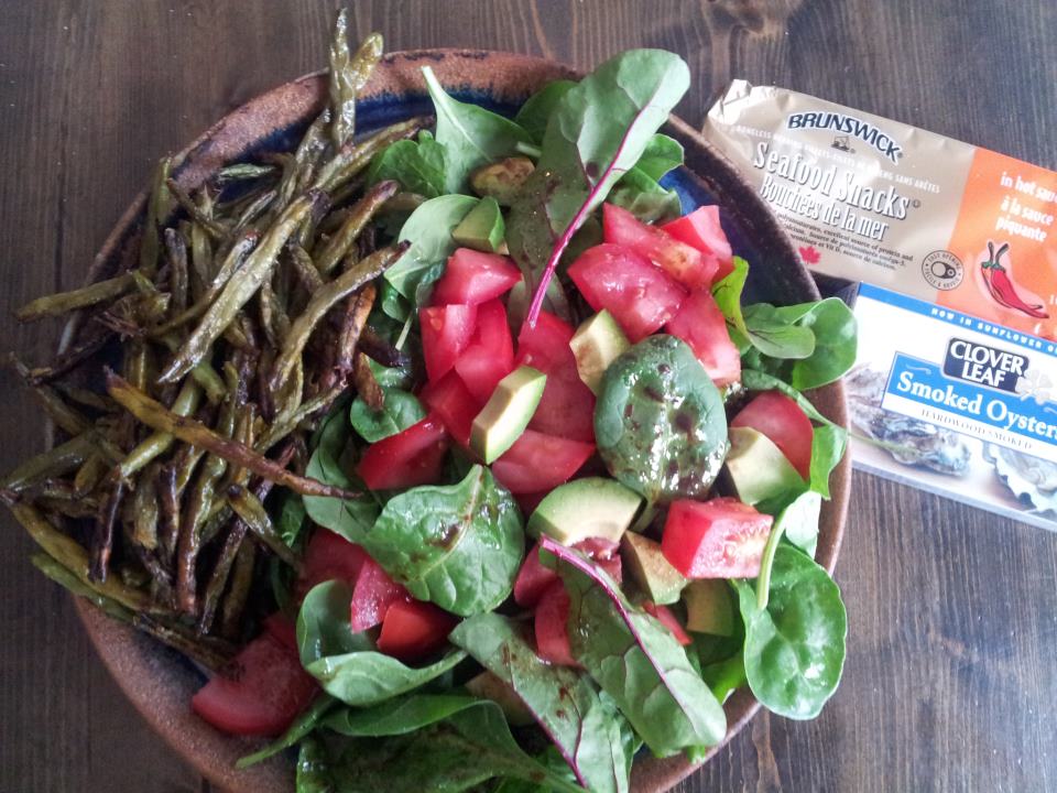 Well, I am ‘off duty’ in the dinner making dep’t tonight, both big guys aren’t here for dinner, little guys wanted pizza, soooo (fist pump!!!!!) I’m on my own!  Yeah!  Okay so , let me first off say, it is really important to eat what you really love, even if it doesn’t make sense….So I am having my fav, roasted green beans (French fries!), a simple salad of that great mix of baby chard, spinach… and baby Bok Choy that I have tossed some chopped tomatoes and avocado onto.  Drizzled with my balsamic dressing.  And, at press time, lol, I have not yet decided on my protein, hmmmmm, spicy seafood snack or smoked oysters?!  Decisions decisions, so classy, hey?!  So that’s it for tonight, sometimes it’s impressive, sometimes, it’s not! 😉