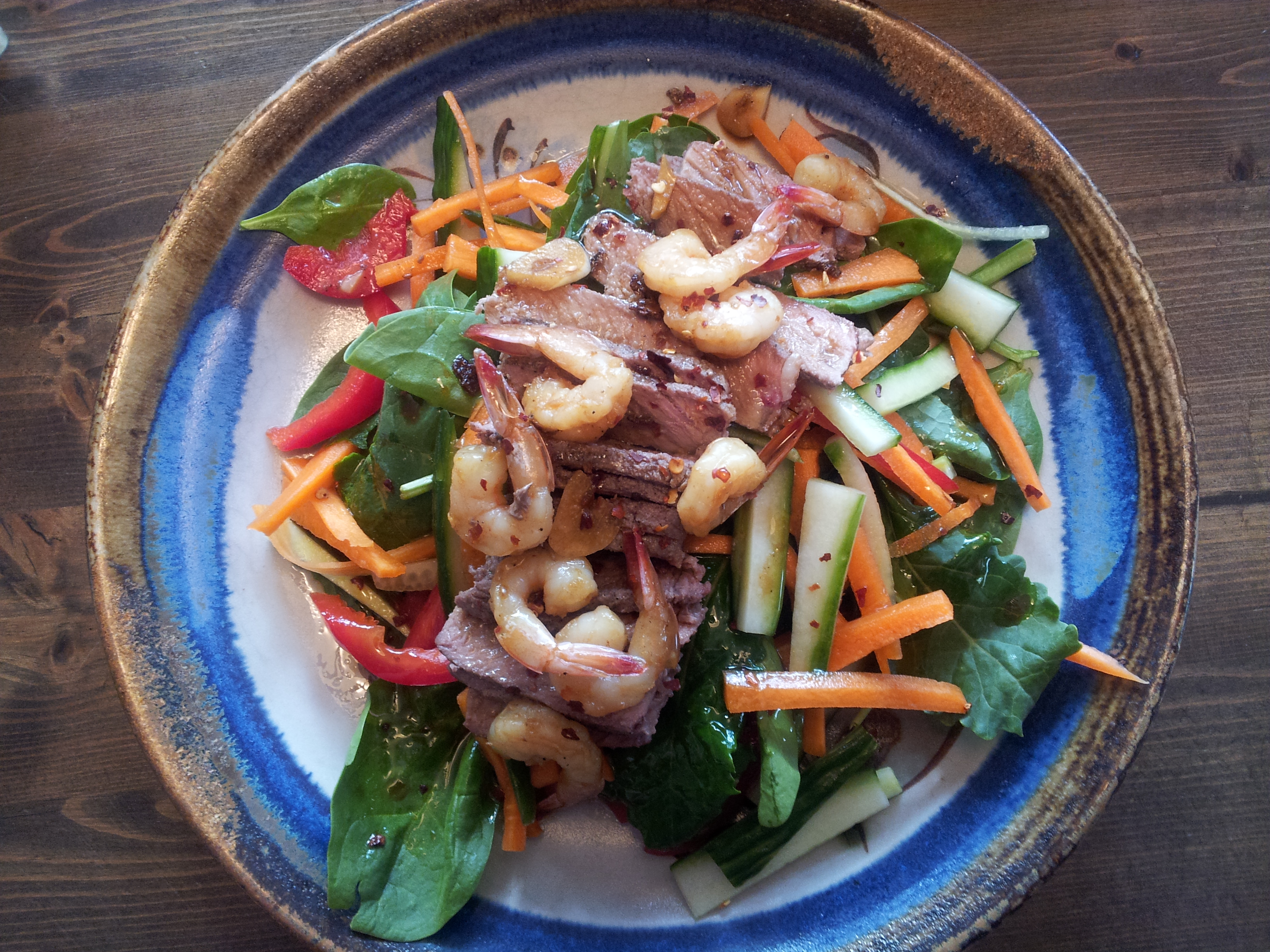 Rib eye steak & shrimp on baby kale, baby spinach, carrots, cucumber & red pepper, drizzled with a ginger tamari apple cider dressing…(and then post-photo-op, I tossed the forgotten but crucial shredded fresh thai basil, mint & cilantro! ;)…felt very…substantial.