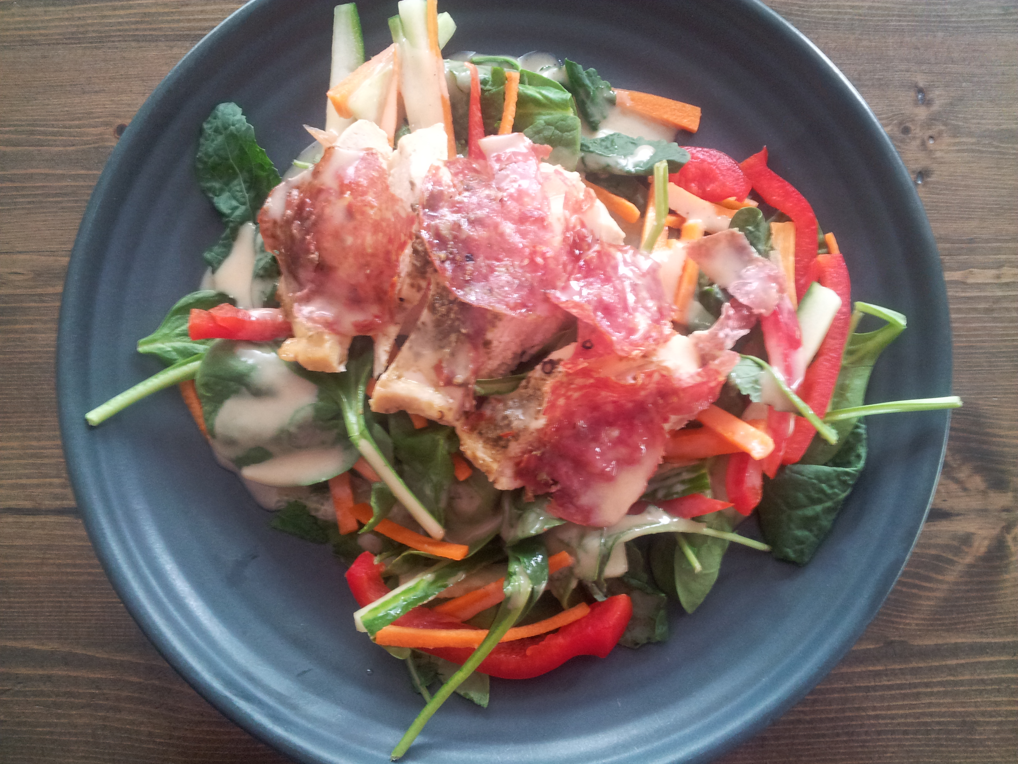 Welllll….sometimes you have a SALAD…sometimes you drop the L and just have a SAAD, lol!  Richard was in charge of dinner tonight so yes, the pesto chicken with salami (yes, salami! man version of prosciutto?! so classy!) was tasty, but since he was having it on pasta with sauce, my salad was a serious afterthought, haha, soooo I plunked that chicken on top of the leftover spinach/kale/carrot/cuke/pepper salad from yesterday, dug to the far reaches of the fridge and found some creamy dressing, and called it dinner 🙂  It was good, but I like my salad to have a distinct theme, so it wasn’t great 😉