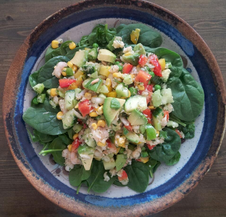Shrimp, Crab, Cuke, Colored Peppers, Corn, Pea and Avocado Salad with a Dill Apple Cider Vinegar/EVOO dressing on a bed of baby spinach 🙂  Ohhhh it was GOOD!  Very fresh and perfect end to this hot summery day!