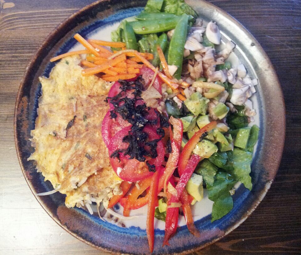 Bean Sprout Egg Foo Young, red bell peppers, carrots, snow peas, mushrooms, avocado, tomato and sea weed on romaine with a ginger garlic tamari vinaigrette 🙂  Yeah!