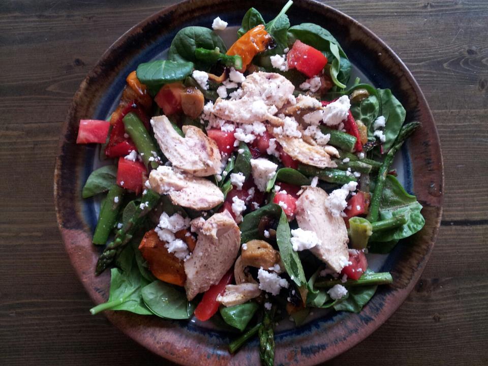 Lemon garlic roast chicken + roasted portobellos, peppers, onions & garlic + asparagus + diced fresh tomatoes + goat feta + creamy red wine vinegar dressing on a bed of baby spinach & chard = yum 🙂