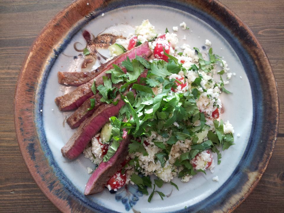 Cauliflower Tabbouleh ~ food processer-ed until couscous size cauliflower, cherry tomatoes, cukes, green onion, mint & parsley with a garlic, lemon, evoo dressing + marinated fast fry steak topped with cilantro & basil.  All these delicious fresh herbs have me really looking forward to warm enough weather to get my deck herb garden going!