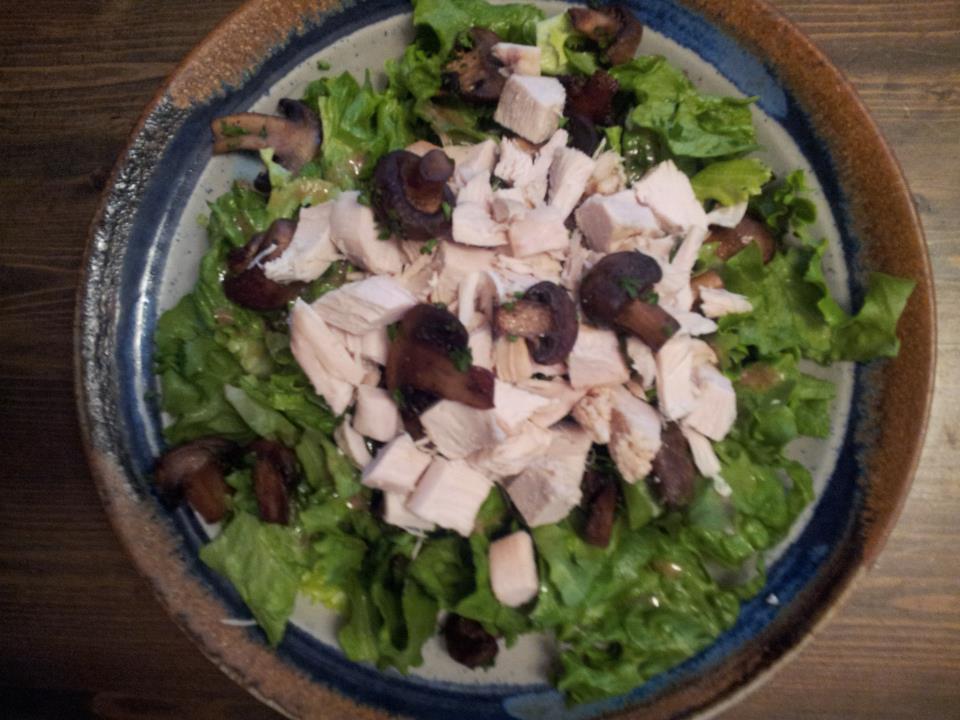 Turkey Caesar Salad + Pan Roasted Mushrooms….and yes, on green leaf lettuce not romaine…’cause nothing was worth attempting even the quickest trip into the grocery store tonight with these two little fellas!!!! :/